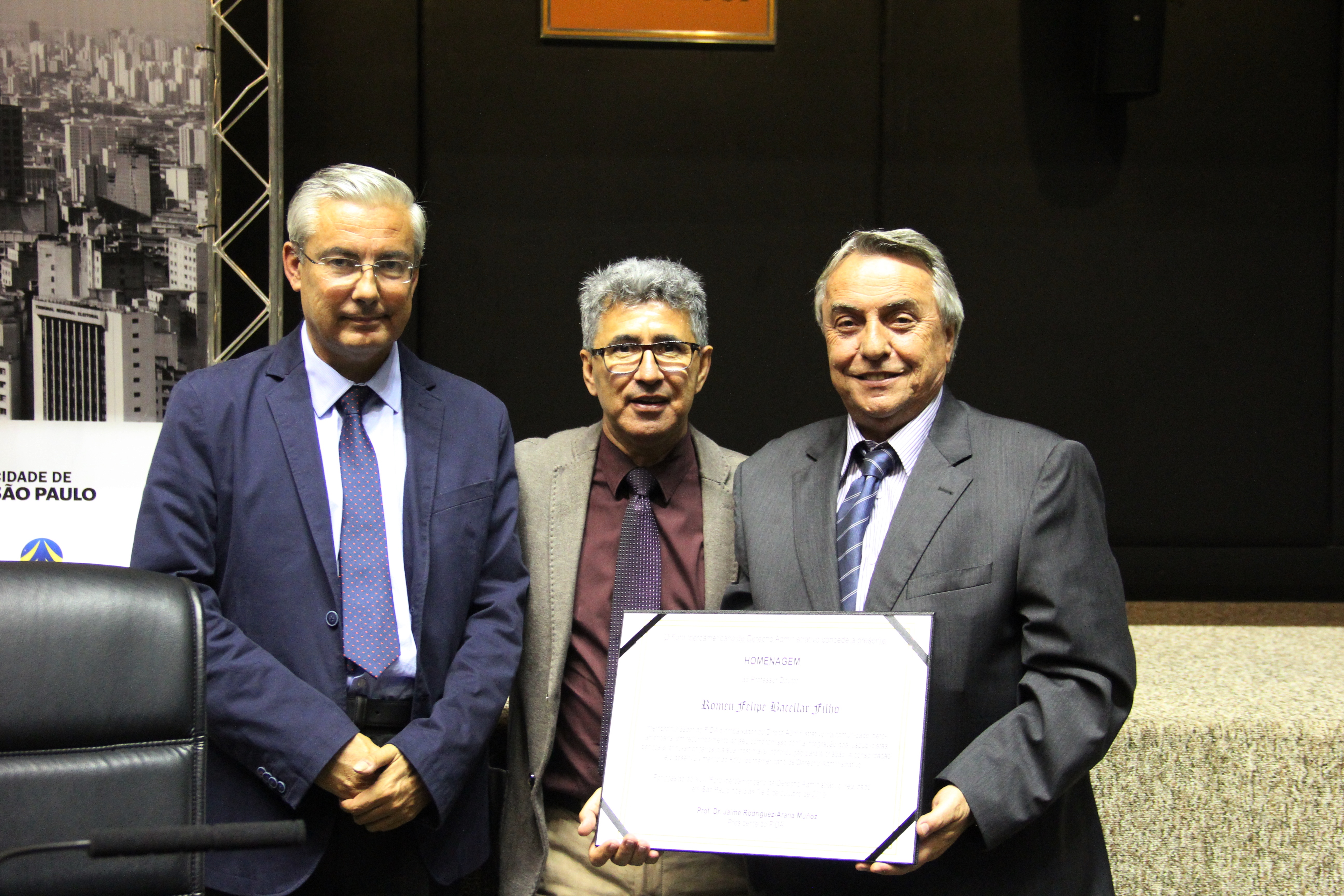 Na sequência, foi realizada uma homenagem ao professor Dr. Romeu Felipe Bacellar Filho, um dos fundadores do FIDA e Titular de Direito Administrativo da Universidade Federal do Paraná e da Pontifícia Universidade Católica do Paraná. O professor Daniel Wunder Rachem, da Universidade Federal do Paraná, foi o responsável pelo discurso de reconhecimento e agradecimento. Uma placa comemorativa foi entregue ao homenageado pelo presidente do FIDA, Jaime Rodríguez-Arana, e pelo presidente do TCMSP, João Antonio da Silva Filho.