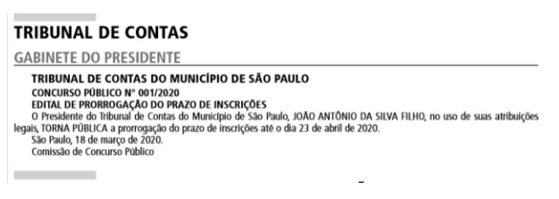 De acordo com o edital publicado no Diário Oficial dessa quinta feira (19/3/2020), as inscrições do concurso do TCMSP foram prorrogadas até dia 23/4/2020.