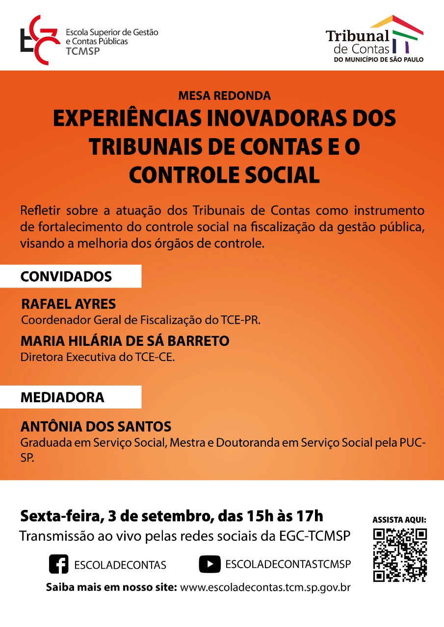 A Escola de Gestão e Contas do Tribunal de Contas do Município de São Paulo (TCMSP) realizará, no próximo dia 3 de setembro, uma mesa-redonda, em ambiente virtual, para refletir sobre a atuação dos Tribunais de Contas como instrumento de fortalecimento do controle social na fiscalização da gestão pública, visando a melhoria dos órgãos de controle.