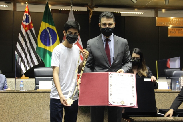 A honraria concedida ao saudoso prefeito Bruno Covas, falecido em maio passado vítima de um câncer, foi entregue ao seu filho, Tomás Covas.