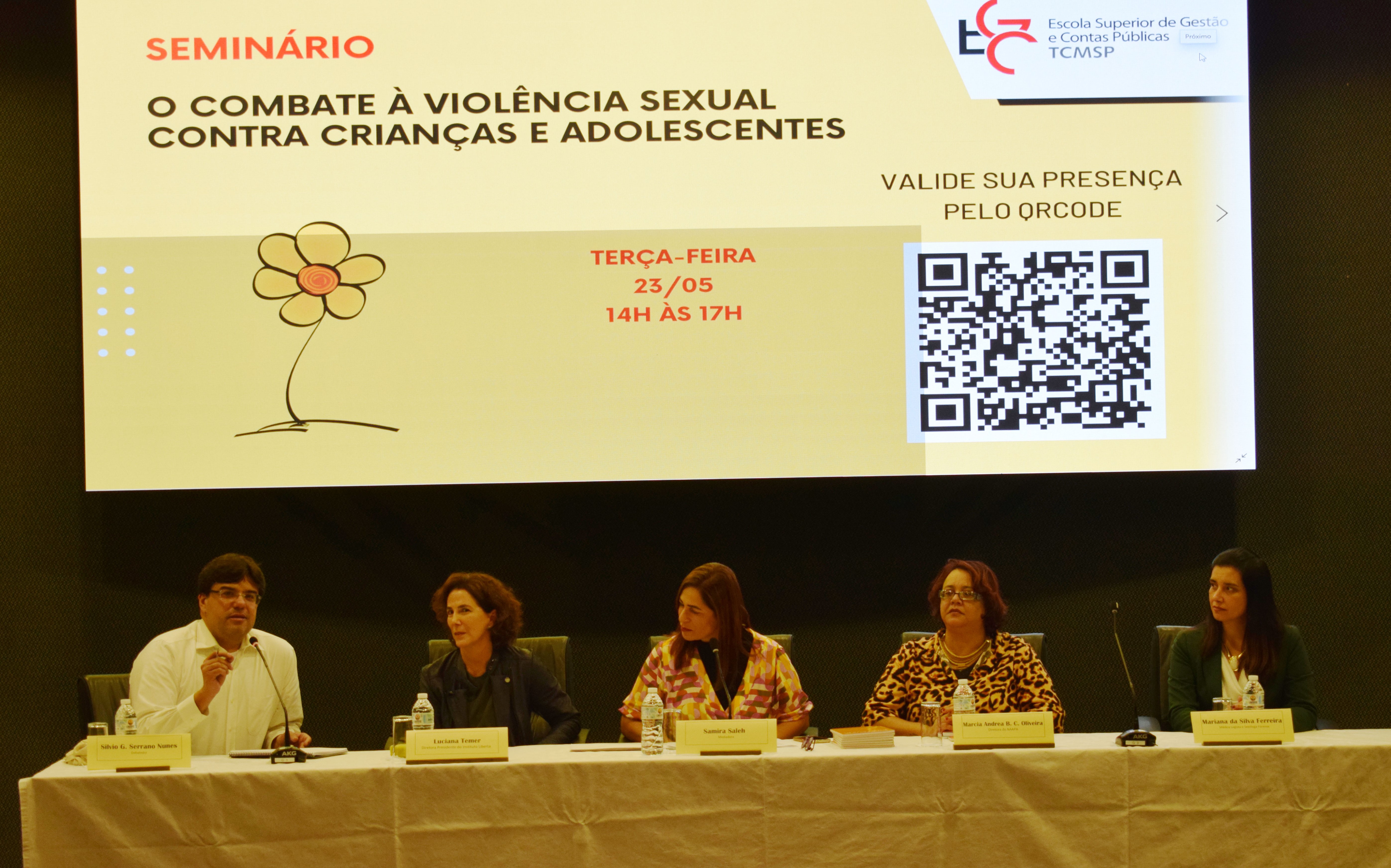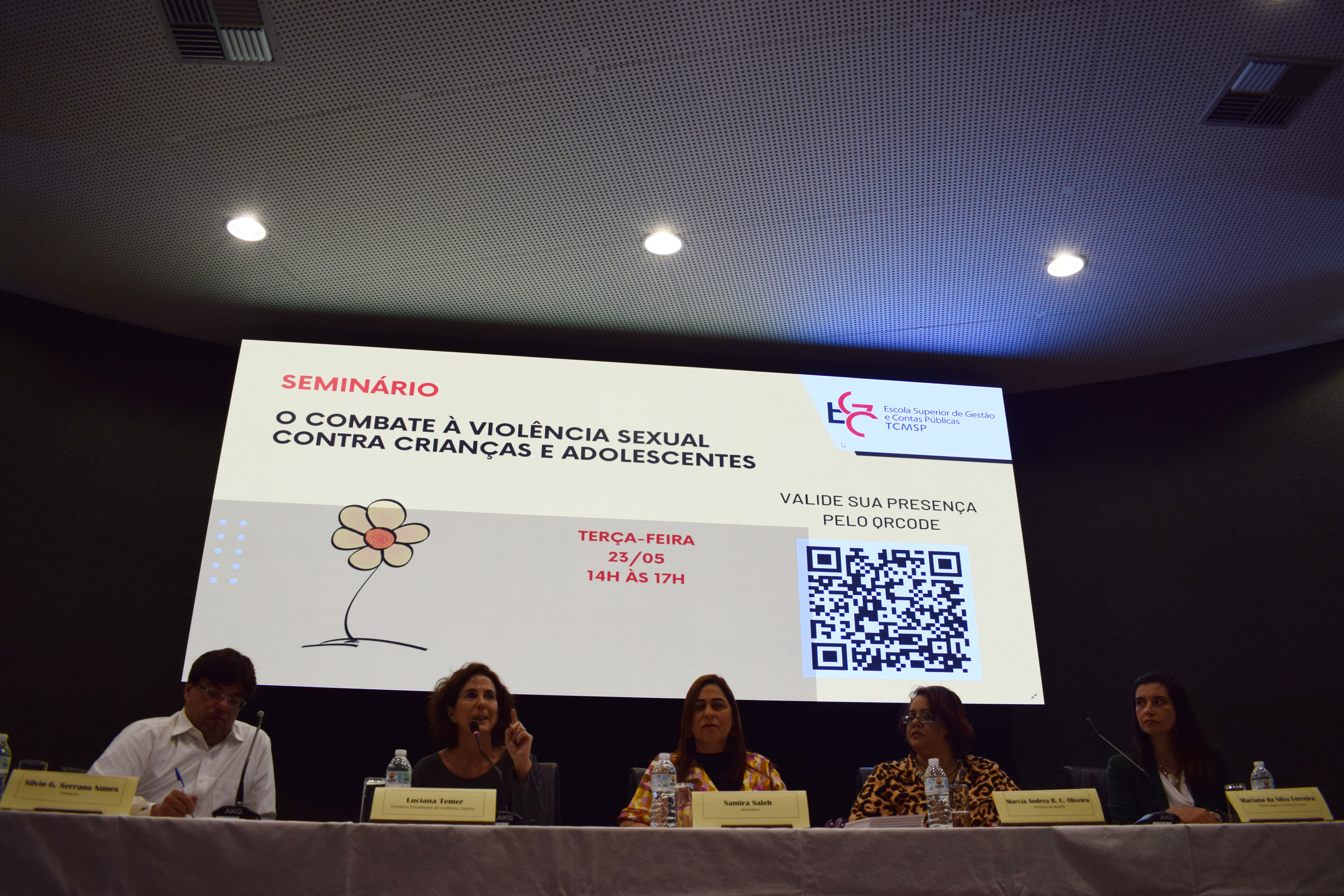 Na tarde desta terça-feira, 23 de maio, ocorreu, no auditório da Escola de Gestão e Contas Públicas (EGC) do Tribunal de Contas do Município de São Paulo (TCMSP), o seminário “O combate à violência sexual contra crianças e adolescentes”. Com participação da diretora-presidente do Instituto Liberta e ex-secretária de Assistência e Desenvolvimento Social do município de São Paulo, Luciana Temer, da diretora do Núcleo de Apoio e Acompanhamento para Aprendizagem (NAAPA) da Secretaria Municipal de Educação (SME), Márcia Andrea Bonifácio da Costa Oliveira, e da médica legista e sexóloga forense Mariana da Silva, o evento foi mediado pela pedagoga e mestranda da PUC-SP e servidora da EGC/TCMSP, Samira Saleh e contou ainda com a participação do professor da EGC, Silvio Gabriel Serrano Nunes, na qualidade de debatedor. O conselheiro dirigente da EGC, João Antonio da Silva Filho, o conselheiro presidente do TCMSP, Eduardo Tuma, o diretor presidente da EGC, Ricardo Panato, e o chefe de Gabinete da Escola, Marcos Barreto, também prestigiaram o encontro, que reforçou a necessidade de romper com a invisibilidade da violência sexual cometida contra as crianças e adolescentes, um crime grave e bastante frequente, mas cuja verdadeira dimensão ainda é pouco conhecida por conta da subnotificação das ocorrências e pela omissão de quem as presencia.