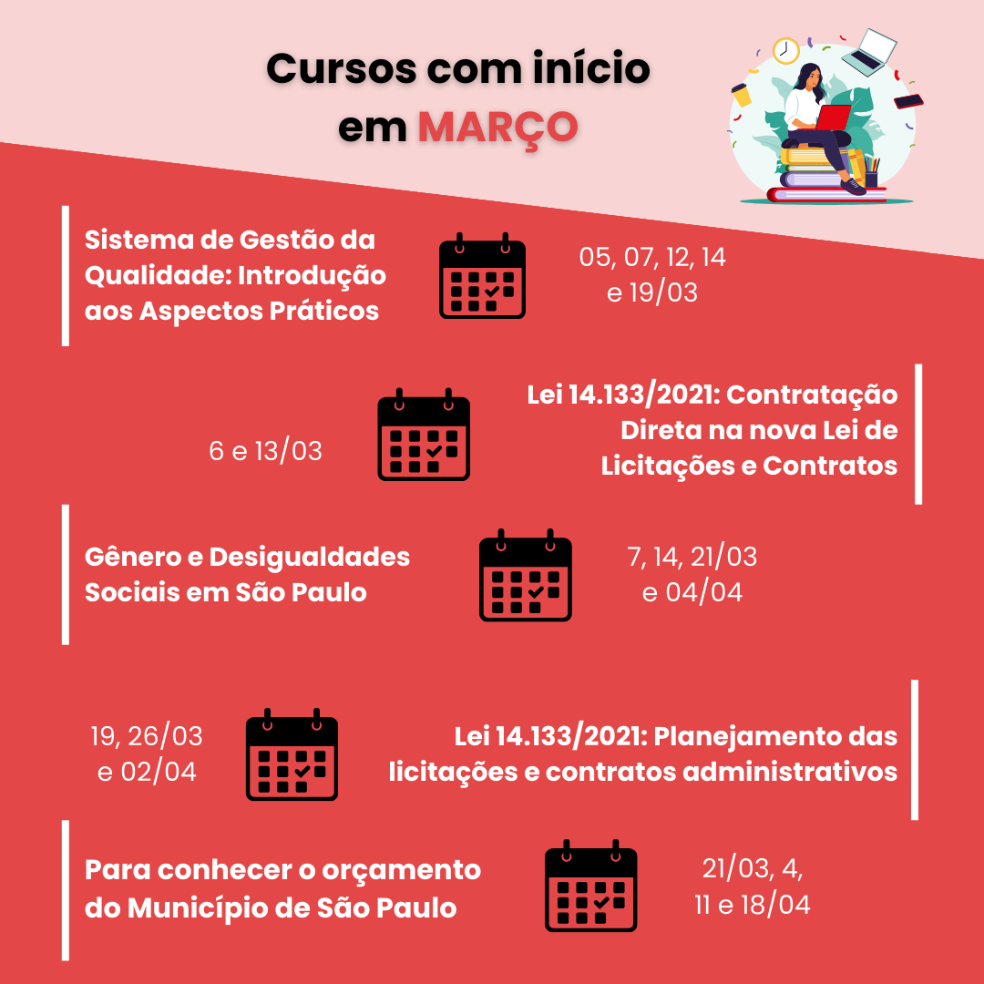Na modalidade presencial, será realizada a primeira aula do curso “Para conhecer o orçamento do Município de São Paulo”, na quinta-feira, dia 21 de março, das 14 às 17 horas. Tendo como instrutor Dilson Cruz, a formação visa explicar de forma didática os recursos financeiros da cidade. Para isso, a EGC promove gratuitamente o curso de extensão, que tem por objetivo capacitar o aluno a localizar e analisar informações relacionadas ao orçamento municipal, bem como sua execução, por meio da manipulação de documentos oficiais digitais. A formação composta de quatro encontros será encerrada no dia 18 de abril, no mesmo horário.