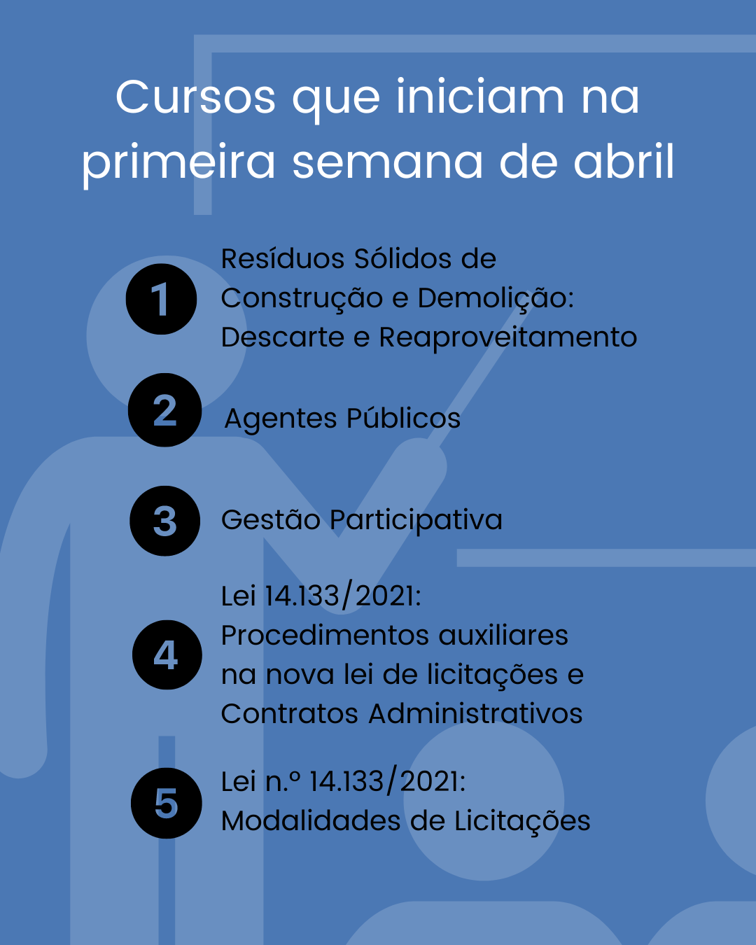 No dia 04 de abril, das 14h às 17h, o curso virtual vai cuidar do tema “Lei 14.133/2021: Procedimentos auxiliares na Nova Lei de Licitações e Contratos Administrativos (NLLC)”. Por meio da formação, o aluno da EGC fica sabendo quais os mecanismos previstos no artigo 78 da NLLC que merecem atenção, aprofundando-se nas novidades e alterações dessa lei, para viabilizar sua aplicabilidade pela Administração Pública. A organização é da professora Luciana Andrea Accorsi Berardi, com participação nas aulas dos professores doutores Ronaldo Andrade; Ana Maria Pedreira; André Malheiros; e, Ricardo Ribas.