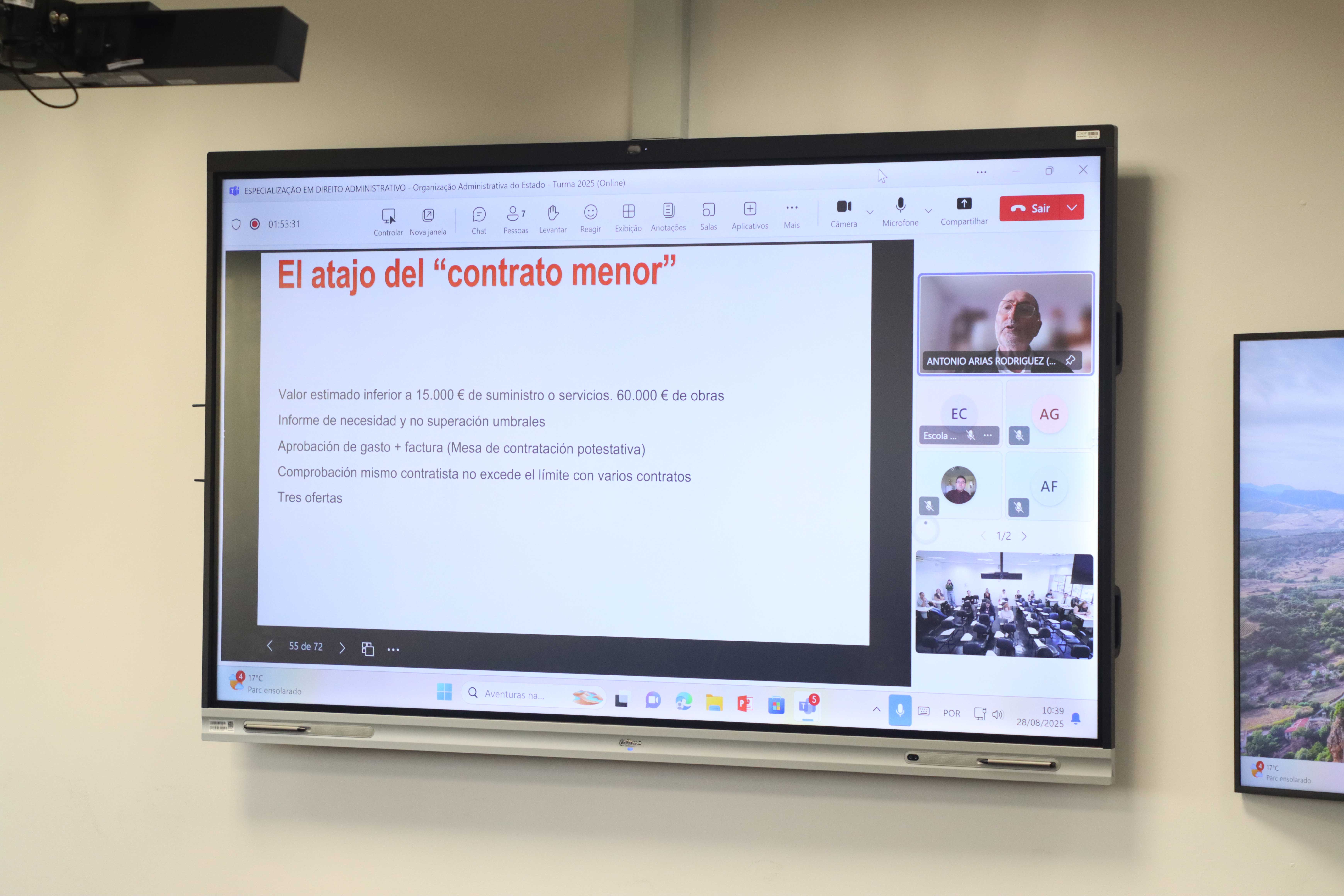 Com uma apresentação didática e bastante detalhada em termos de conteúdo audiovisual, o professor dessa aula especial aos alunos do curso de pós-graduação da EGC fez diversas análises comparativas sobre as legislações aplicadas e os trabalhos de fiscalização e controle externo, demonstrando as similaridades existentes entre Espanha e Brasil.