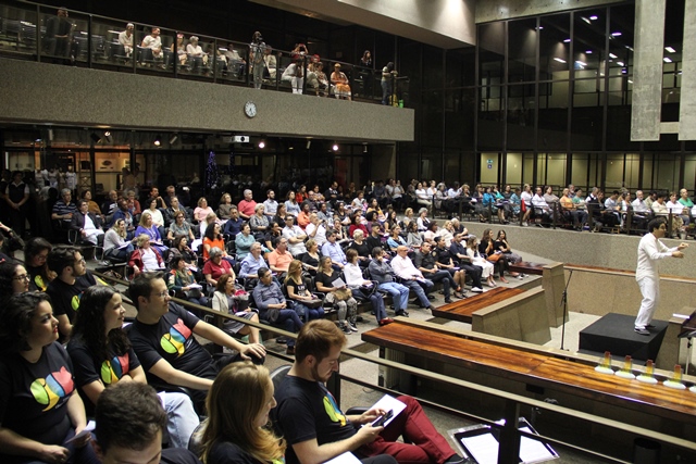 Em seguida, o Coro Jovem Cênico Mackenzie, formado por alunos e ex-alunos daquela universidade, mostrou o espetáculo “O Coro Pede Passagem”, iniciado em 2017 e apresentado em estações do metrô da cidade. Sob a regência de Cláudia Mussi, o grupo cantou clássicos como “The Beauty and The Beast” (Alan Merken), “You’ll Be in My Heart” (Phil Collins), “Vilarejo” (Marisa Monte), “Lavadeira do Rio” (Lenine), “Homenagem ao Malandro” (Chico Buarque) e “Isso Aqui o Que É” (Ary Barroso).